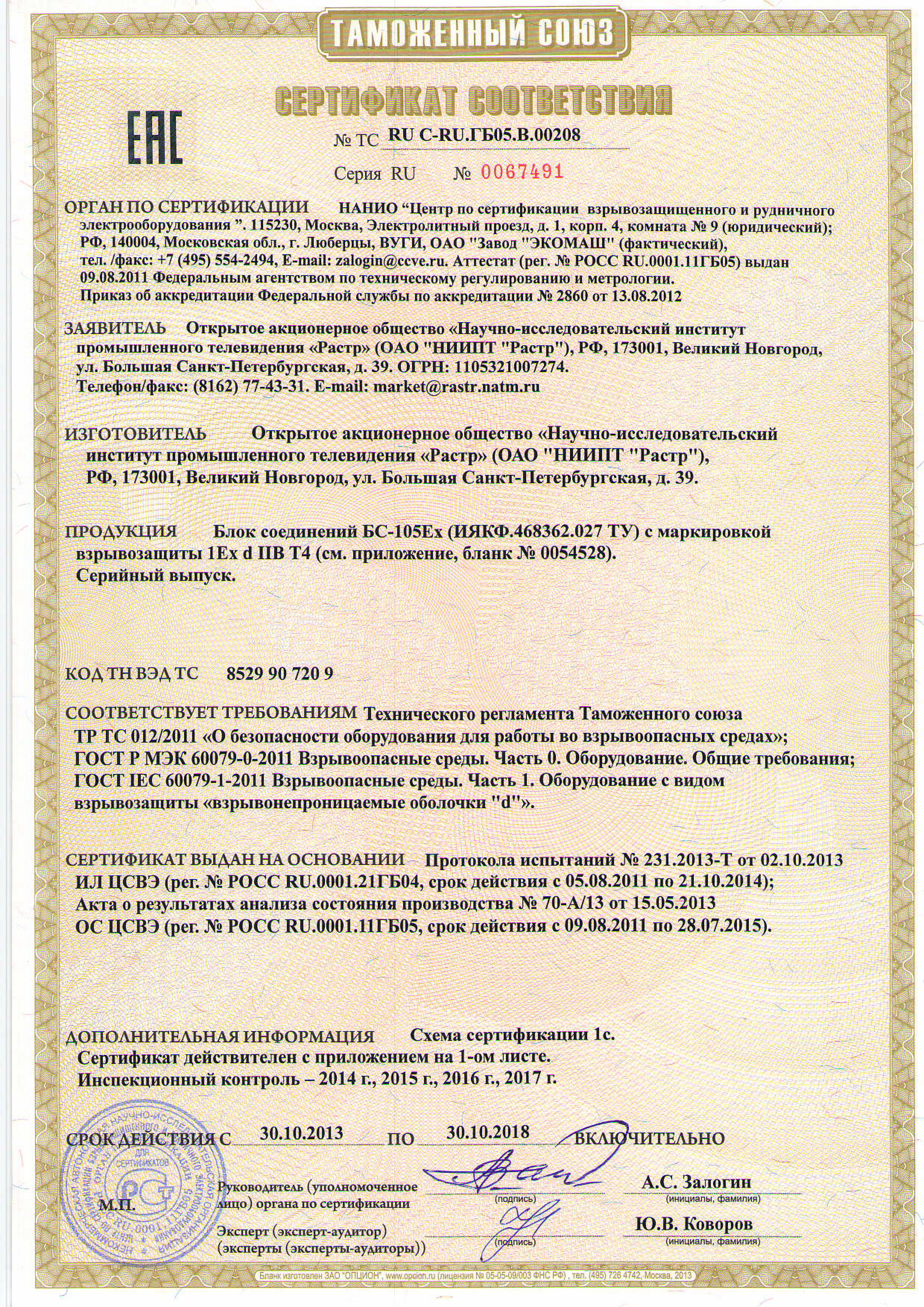 - Сертификат соответствия № ТС RU С-RU.ГБ05.В.00208 на БС-105Ех